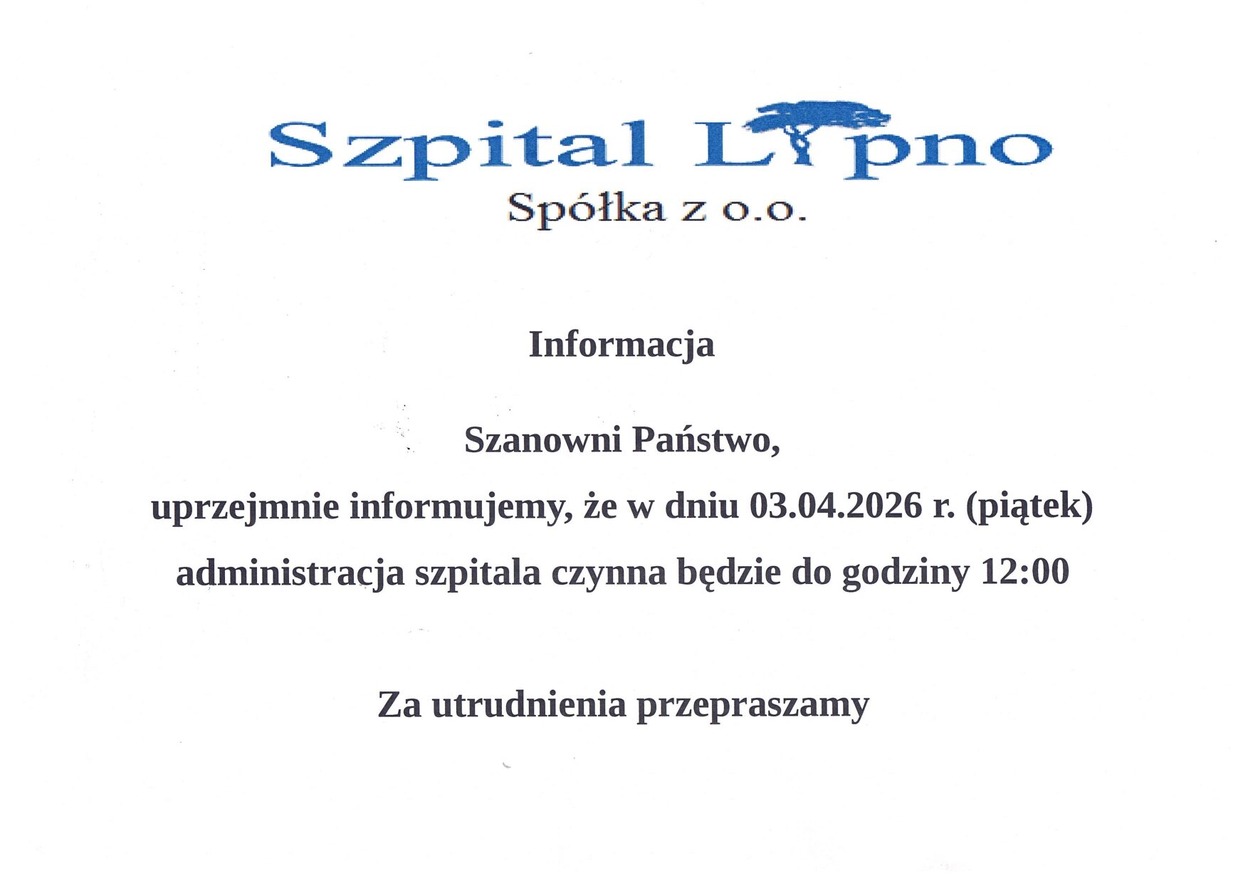 uprzejmie informujemy, że w dniu 03.04.2026 r. (piątek) administracja szpitalna czynna będzie do godziny 12:00.